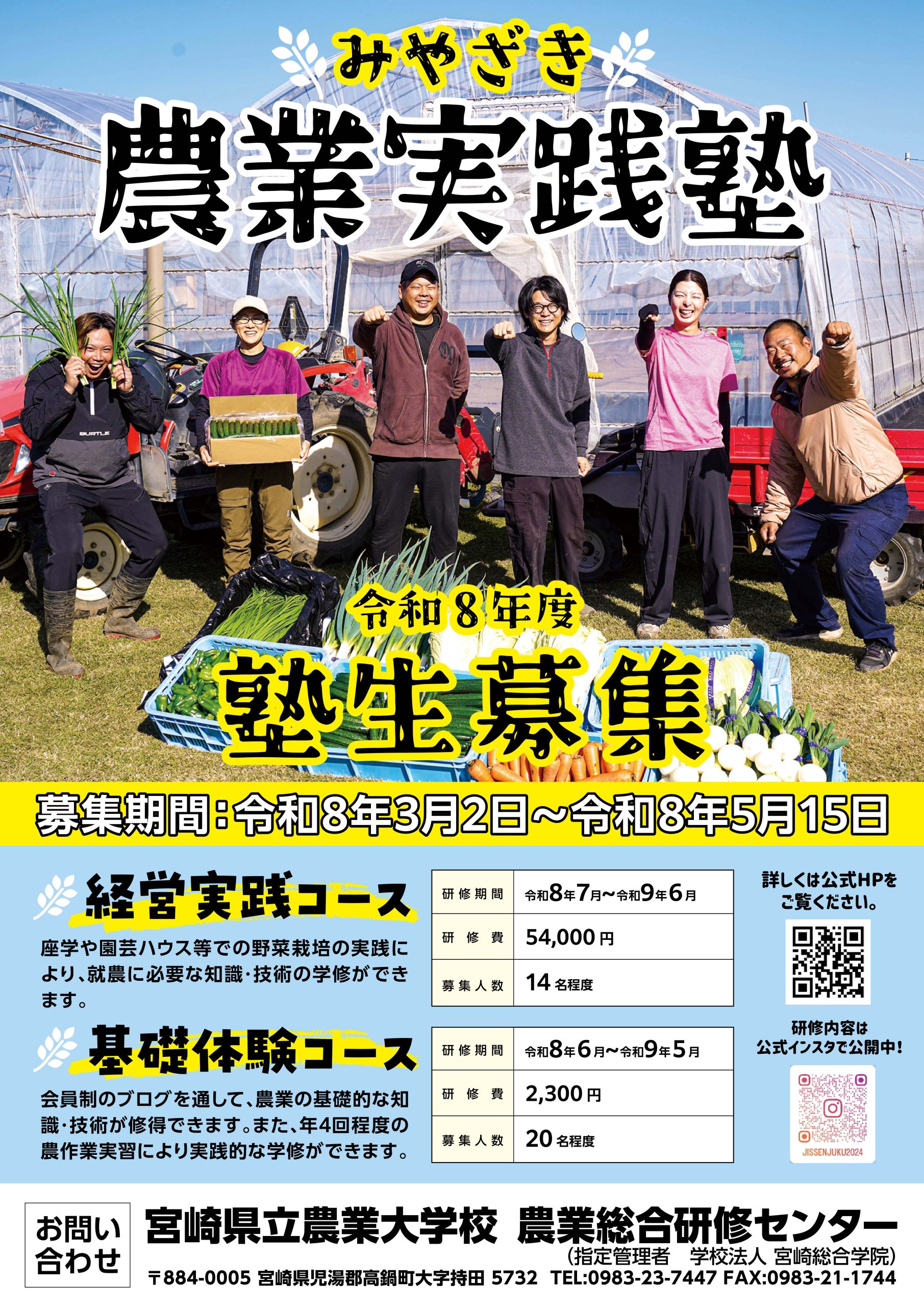 みやざき農業実践塾では、令和8年度「経営実践コース」および「基礎体験コース」の塾生を募集します。